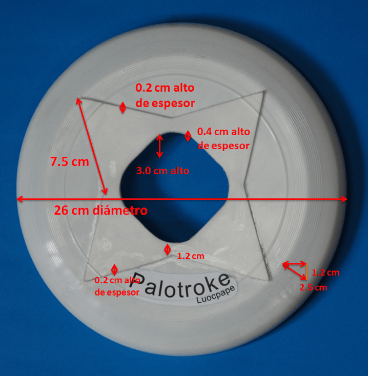 La cara posterior llevará un borde o aleta semi ovalada en su alrededor de 1.6 cm. de altura y 0.5 cm de grosor, las demás partes del platillo tendrán un espesor de 0.2 cm. Llevara en relieve de 0.2 cm la marca PALOTROKE-LUOCPAPE.