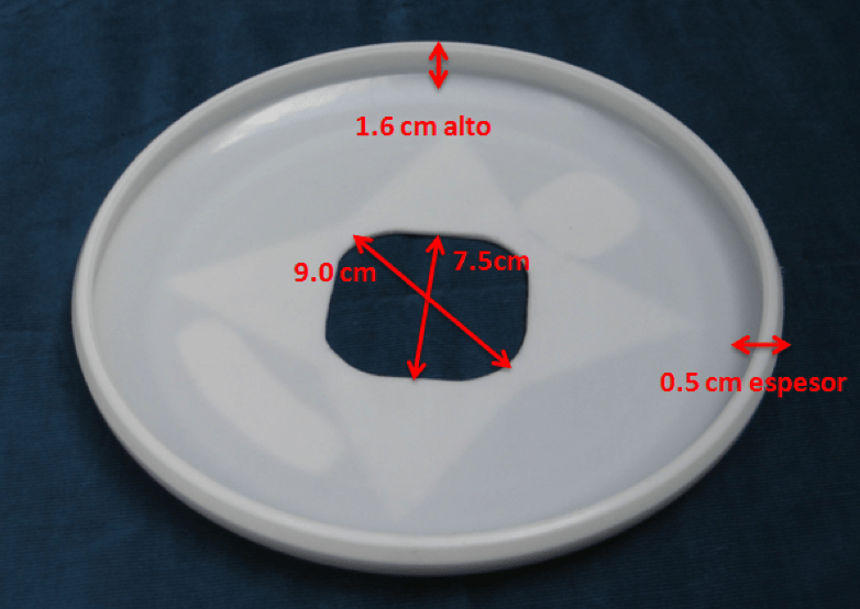 2.1- EL PLATILLO: será de material plástico flexible no quebradizo fabricado en polietileno de baja densidad de 26 cm de diámetro en su parte exterior, con una abertura ovoide en el centro de 7.5 cm de diámetro, su peso será de 175 gramos.