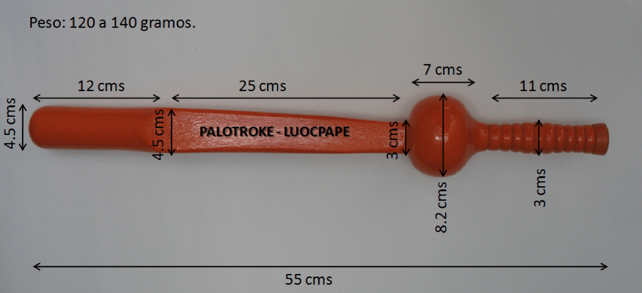 Su extremo superior será de 4.5 cm de diámetro por 12 cm de largo, su parte central de 25 cm será cónica descendente de 4,5 por 4.5 cm en la parte superior y de 3,0 por 3.0 cm en la parte inferior, continua con un ovalo rígido de 7 cm de largo por 8.2 cm de alto, finaliza con un mango ergonómico de 11 cm de largo y un diámetro de 3 cm. En una de las caras cónicas llevara en relieve de 0.2 cm la marca PALOTROKE-LUOCPAPE.